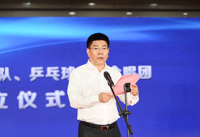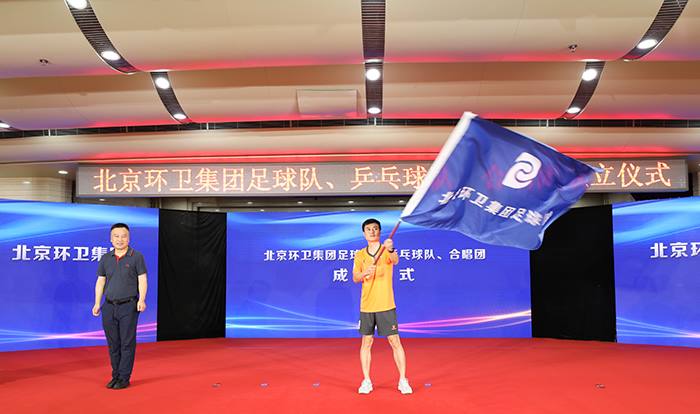 集团党委书记、董事长高踪阳为熊猫体育乒乓球队授旗