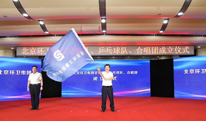 仪式最后,集团领导分别为足球队、乒乓球队、合唱团授旗。