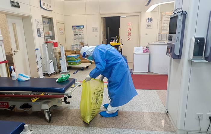 队员在急诊楼封控区内清理病房地面(环服公司 陆勇 摄)