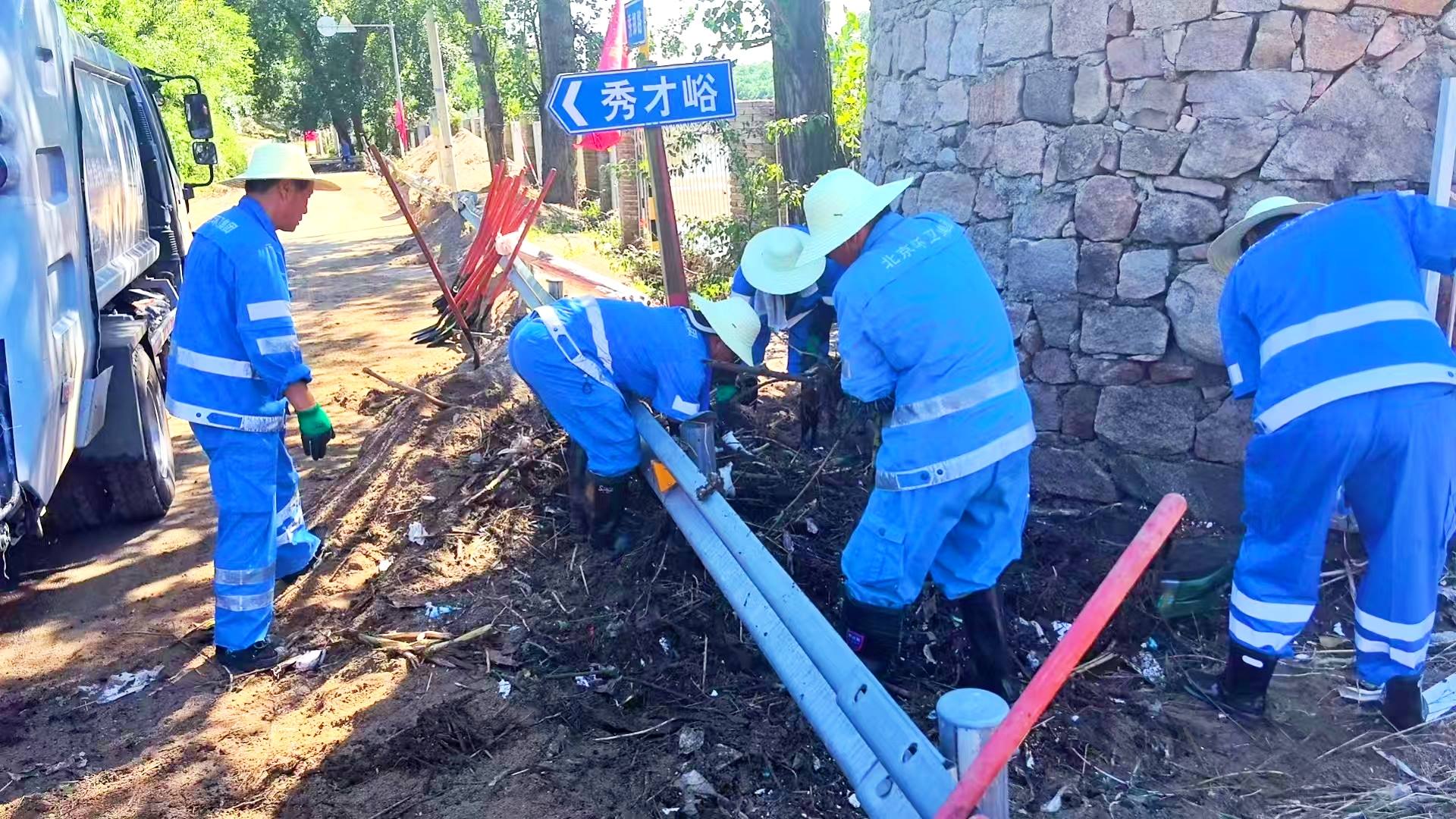 高温天气下,北京市劳动模范、通州公司突击队负责人王晓峰已连续奋战8小时,他抹去头上的汗水说:“我们克服了道路狭窄、作业空间小等困难,力争在最短时间内完成清理任务。”王晓峰和突击队员们的蓝色工作服上都出现了白色的“汗碱花”。
